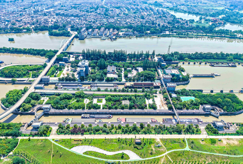 2025年7月4日★✿✿,船舶有序通过京杭大运河扬州段邵伯船闸(无人机照片)★✿✿。新华社发(任飞 摄)
